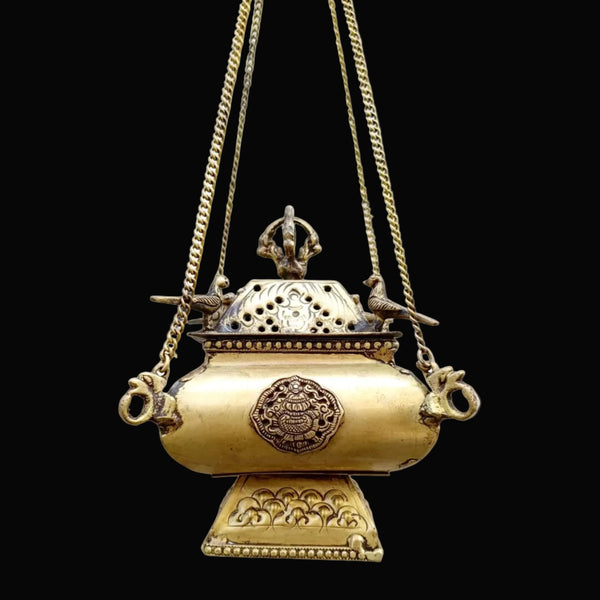 Ornate brass Incense | dhoop burner handcrafted with the mythical hamsa on the cover and an exquisite lotus design at the base. Light the Dhoop ( Dhoop is the cone...