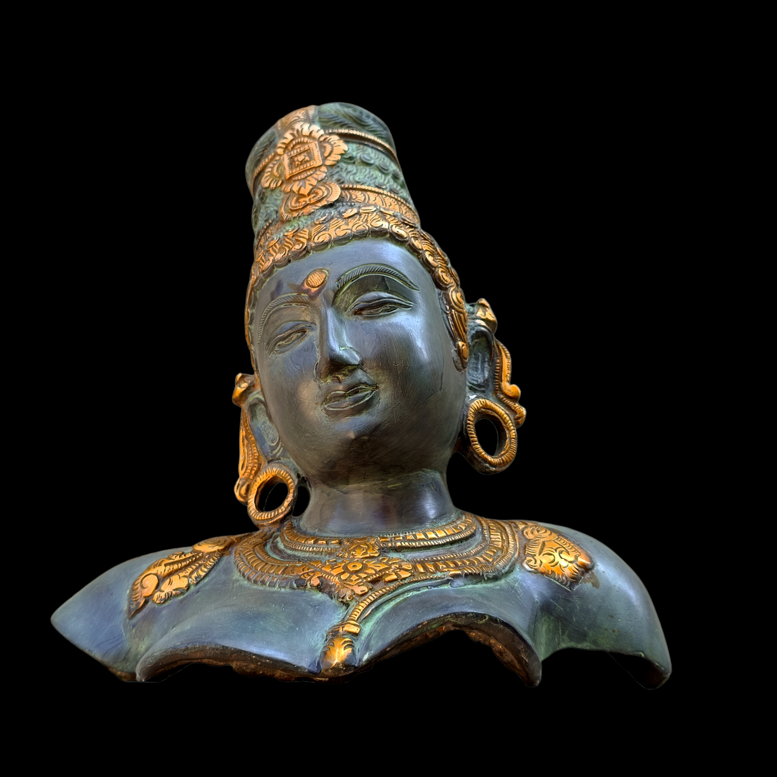 Vintage brass sculpture of Goddess Parvati with an exquisite rich green and gold patina and beautiful almond-shaped eyes, her hair styled in a large conical crown on her head displaying her beauty and fine attire, handcrafted by skilled artisans from the South of India.