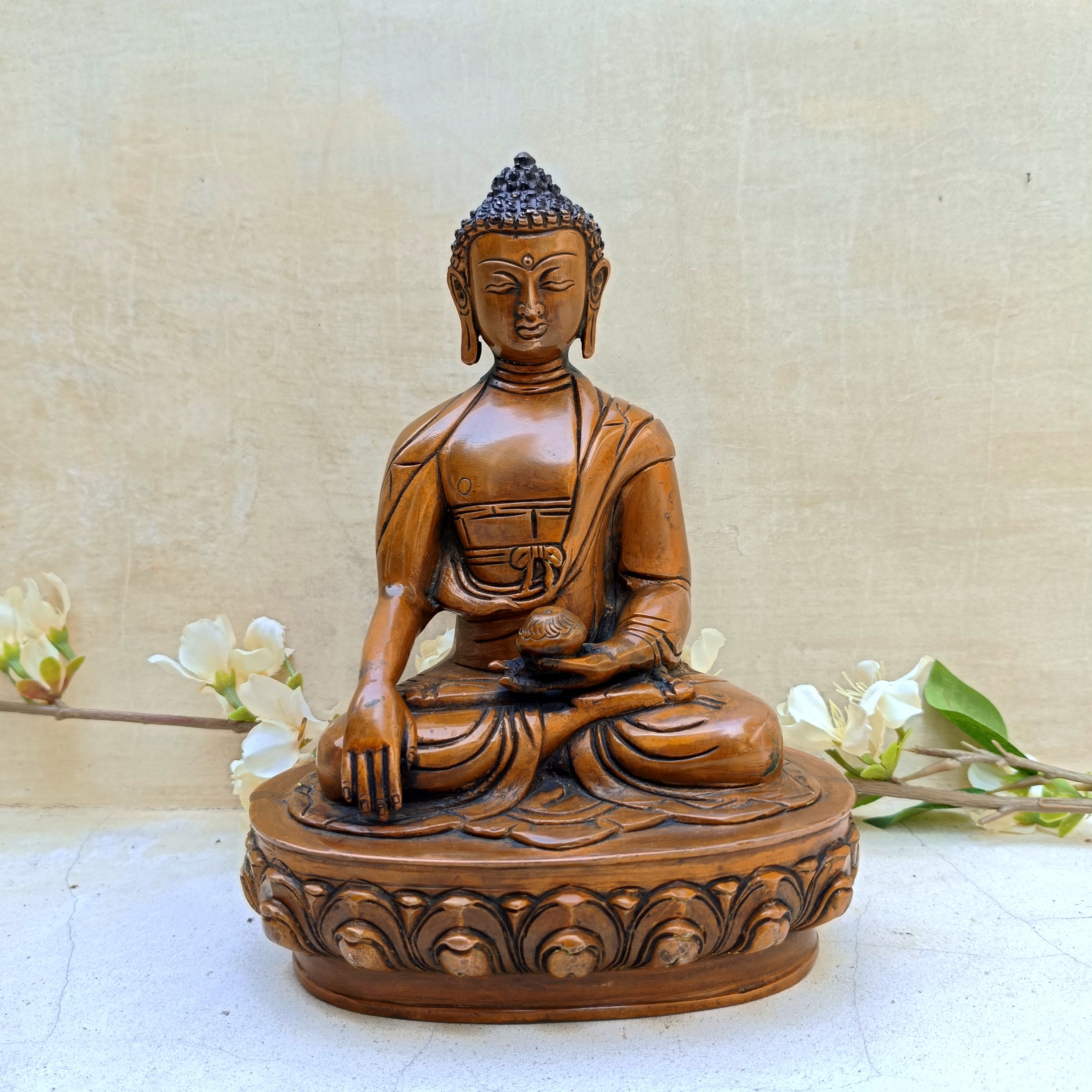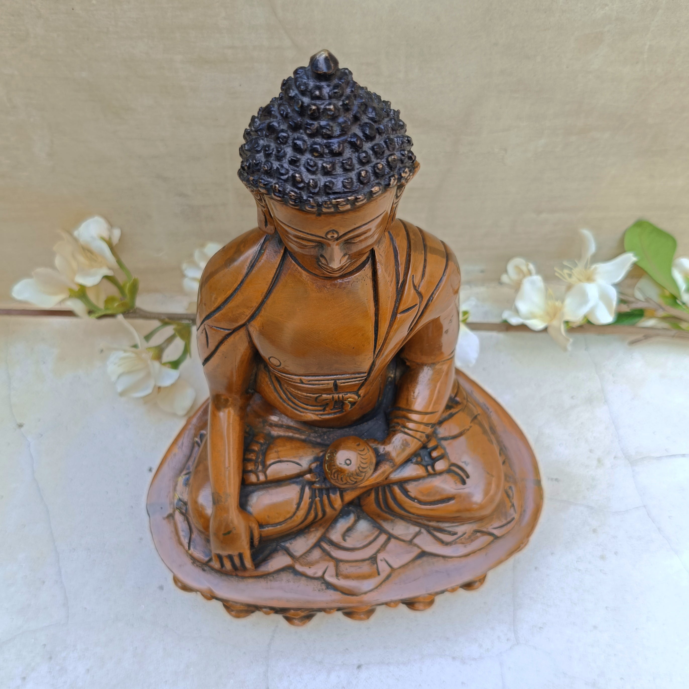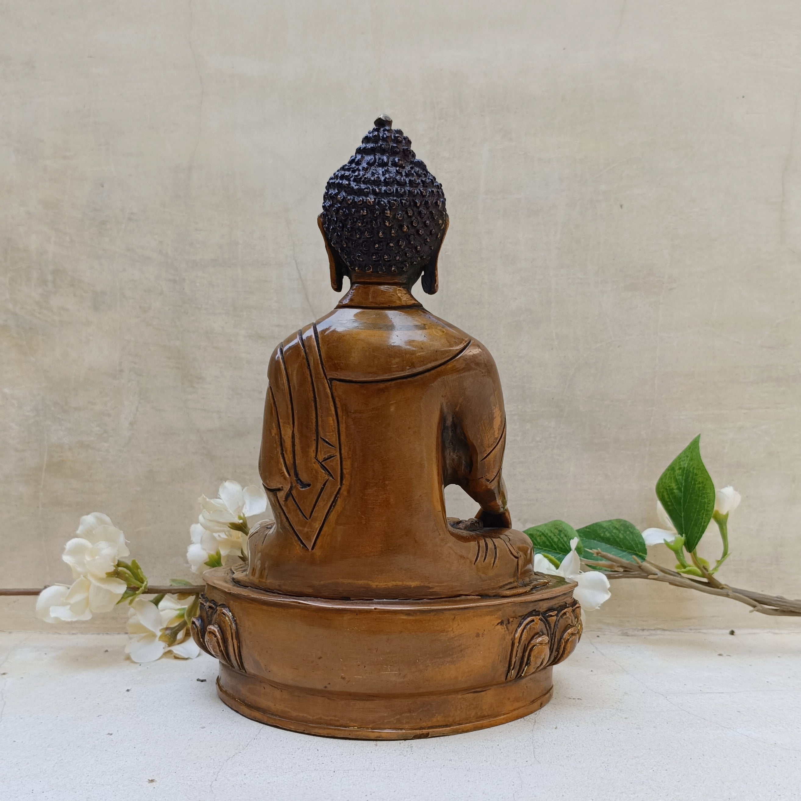 Sculpture of Lord Buddha seated upon a double layered lotus base in a peaceful Earth touching Mudra posture hand casted in solid brass with a copper and gold patina finish crafted by skilled artisans with delicate engraving.