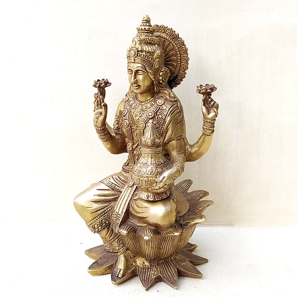 Magnificent brass sculpture of Lakshmi - Indian goddess of wealth and prosperity wearing an ornate robe and fine jewellery sitting on a beautifully crafted lotus flower holding the Kalash. Her four...