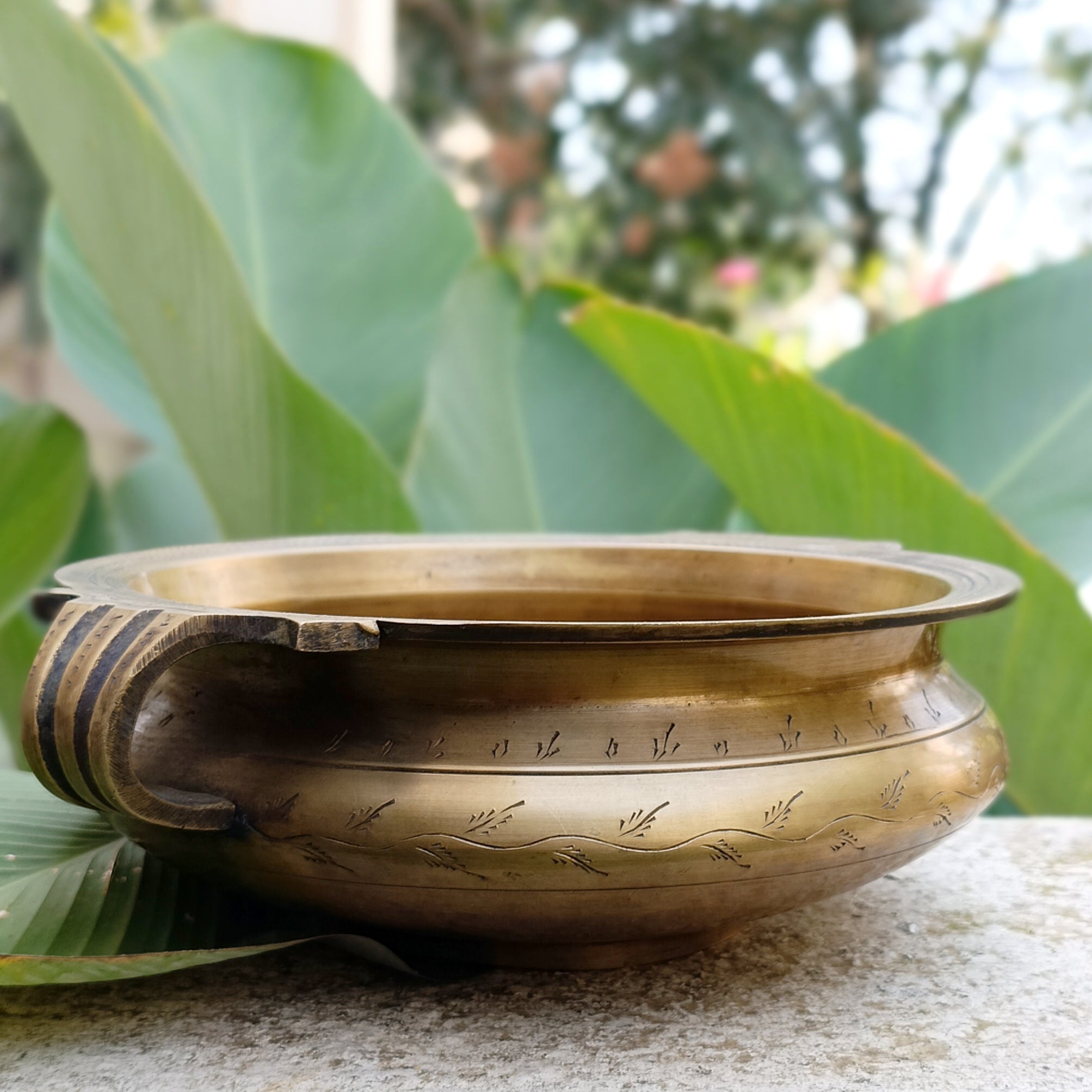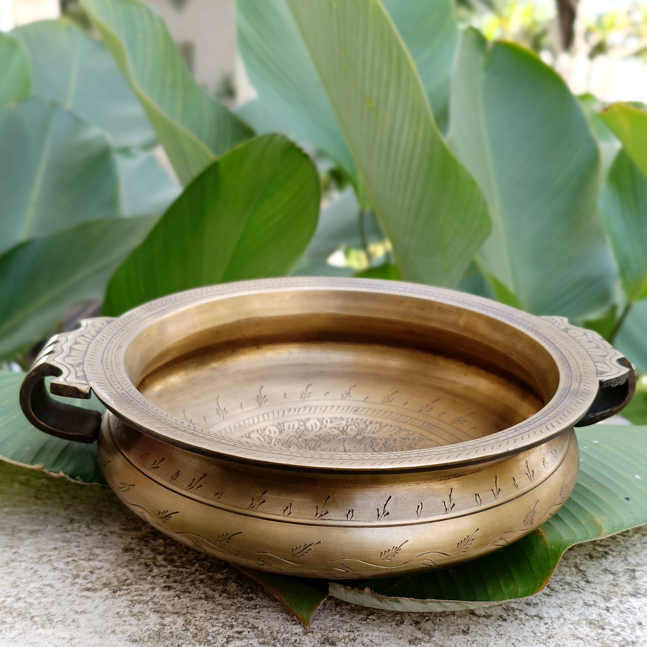 The Uruli at one time was a traditional cookware extensively used in South India and was commonly made of clay, copper and bronze with the name derived from the Tamil word "Urulai" [உருளை] which means a round bowl.