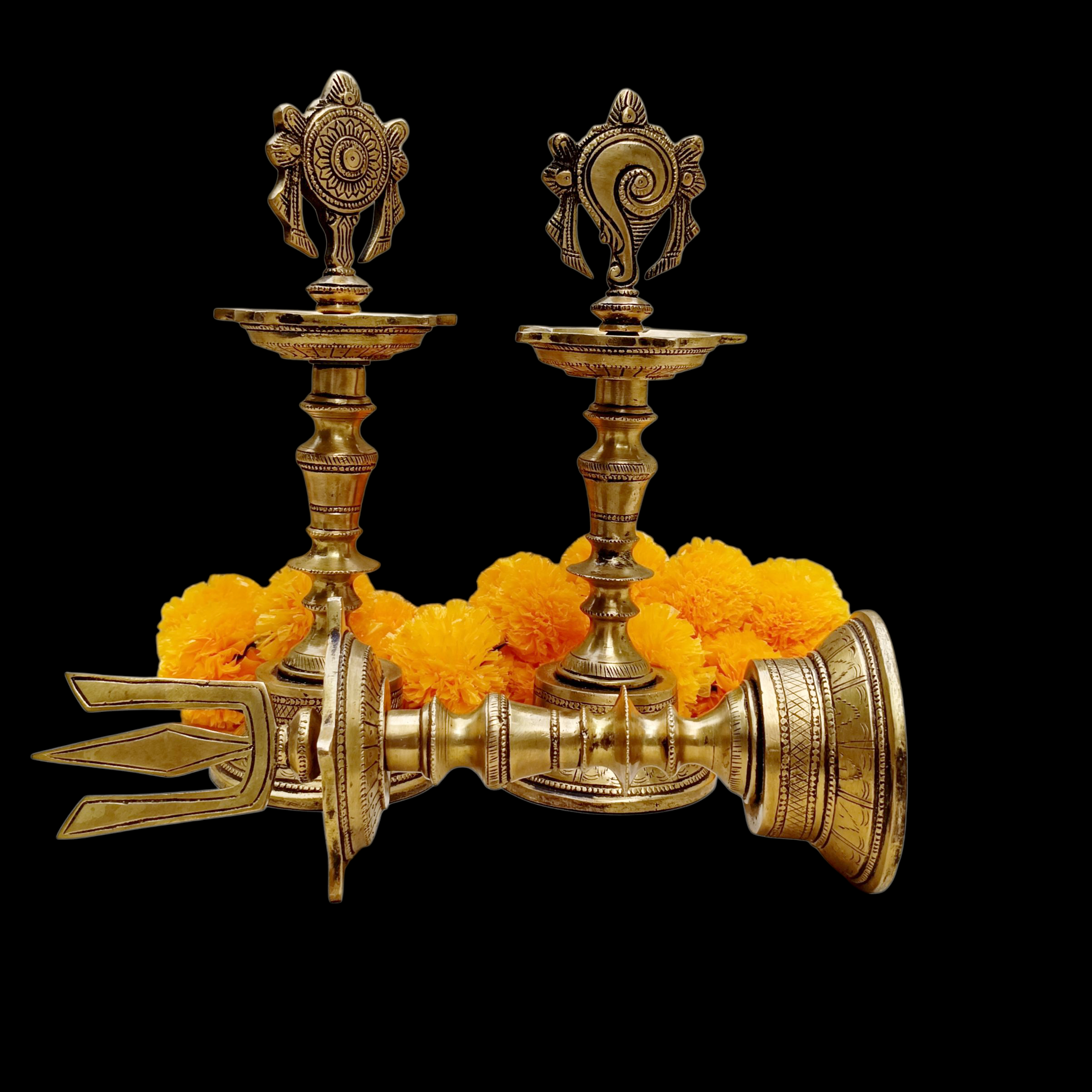 These divine brass Samay oil lamps feature the Shanku, Chakra and Namam symbols of Lord Vishnu, one of the principal deities in Hinduism.