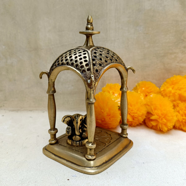 Vintage Jharoka Temple in solid Brass handcrafted by artisans from Rajasthan, India. The temple with an intricately carved canopy in brass stands on 4 pillars and is inspired by the...