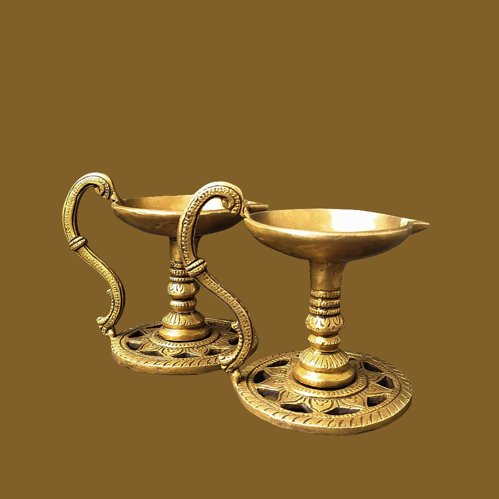 Pair of exquisite tear drop shaped brass oil lamps | Diyas with filigree work handles standing on ornate pillars with a round base, just perfect for your home - To light daily in your puja room, during the festive season or just about anytime.